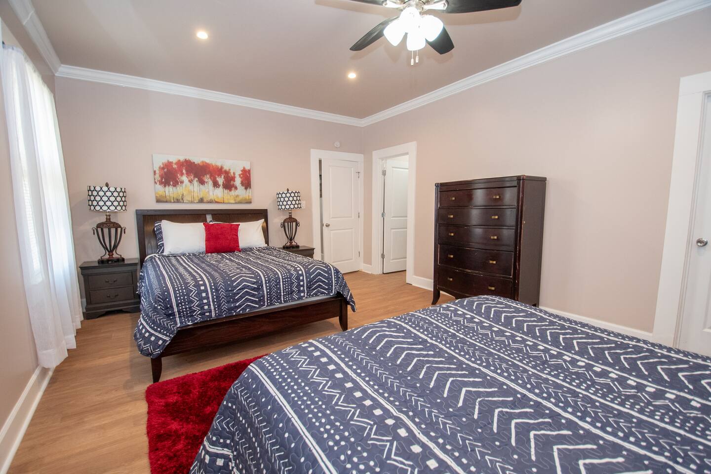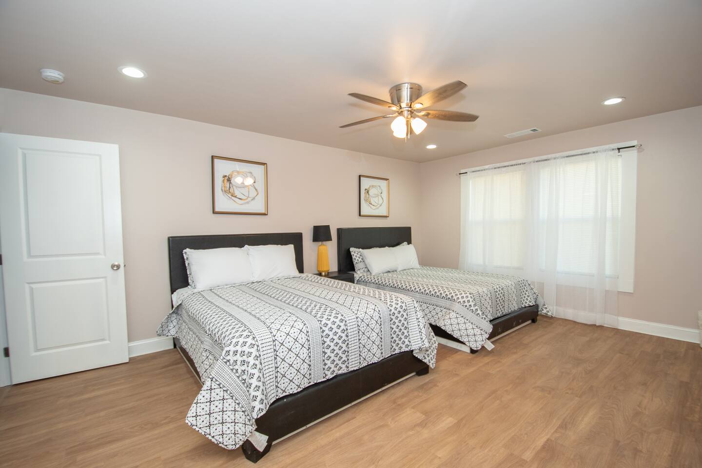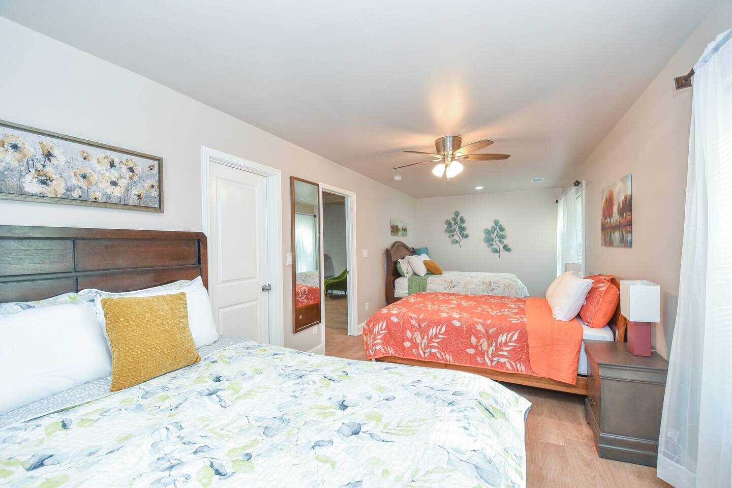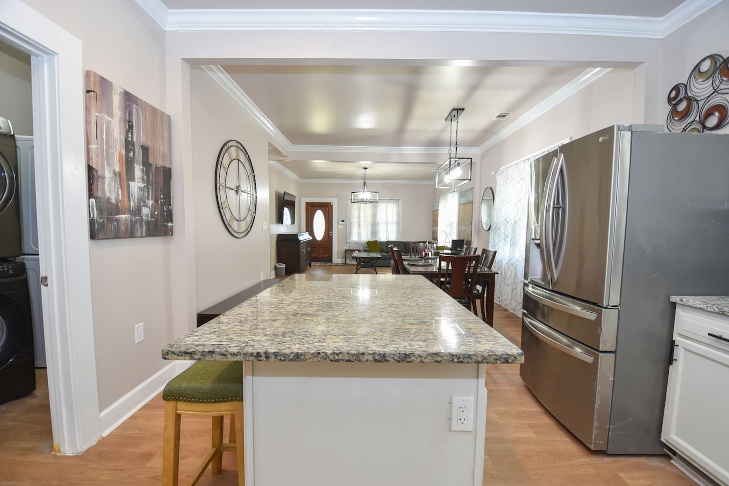 BEDROOMS: This home sleeps 20 guests in 6 bedrooms. See bed count below: Bedroom 1 one queen size bed Bedroom 2 one queen size bed Bedroom 3 two queen size bed Bedroom 4 two queen size beds Bedroom 5 two queen size beds Bedroom 6 three queen size beds BATHROOMS: 4 Bathrooms The bathroom are stocked with toiletries (shampoo, conditioner, body wash, lotion, soap), towels, washcloths, and a hairdryer. This home sleeps up to 22 guests between 6 private bedrooms. Four full bathrooms give your group plenty of space to prepare for your day. ENTERTAINMENT: The house is equipped with flat-screen smart TVs for your use. Note : The TV comes with Netflix access along with 200+ roku channels etc. You and your group will enjoy relaxing in your bright and airy, open concept living room with modern and comfortable furnishings. LIVING ROOM/KITCHEN: -Complimentary snacks & bottled water available for the guests -The kitchen is equipped with brand new stainless steel cookware Laundry room with full-sized washer & dryer